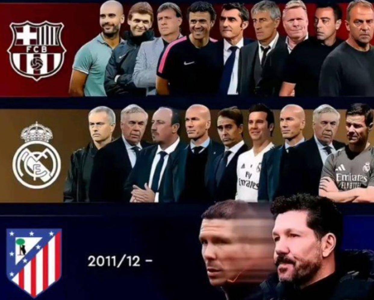 一图看尽西甲14年沧桑!皇马巴萨共换了18次教头马竞独爱1位霸总